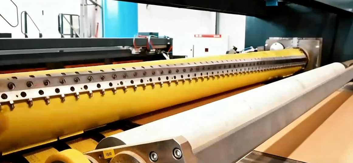 This close-up shows the NC cutter’s cutting unit, ensuring accurate and efficient trimming of corrugated board at high speeds.